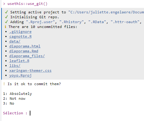 usethis::use_git()dans la console pour activer le traking de git pour ce projet. RStudio vous propose d’enregistrer une version, sorte de premier point de restauration, de votre projet.Acceptez de redémarrer R pour que les fonctionnalités git s’activent dans votre projet Rstudio (nouveau panneau)