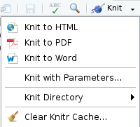 Il faut manier cette option avec beaucoup de prudence. Le système de cache peut fausser les résultats s’il n’est pas utilisé avec maîtrise, par exemple s’il n’est pas vidé alors que les données source changent. Dans ce cas les résultats de certains blocs ne seront pas être mis à jour s’ils sont présents en cache. On peut vider le cache du document, ce qui forcera un re-calcul de tous les blocs de code à la prochaine compilation. Pour cela, ouvrir le menu Knit (la pelote bleue) et choisir Clear Knitr Cache… (le balai) :