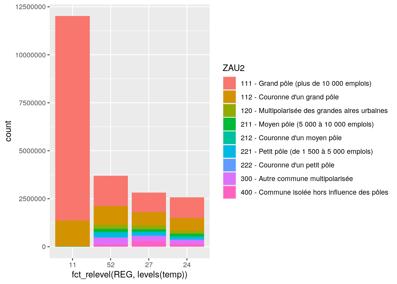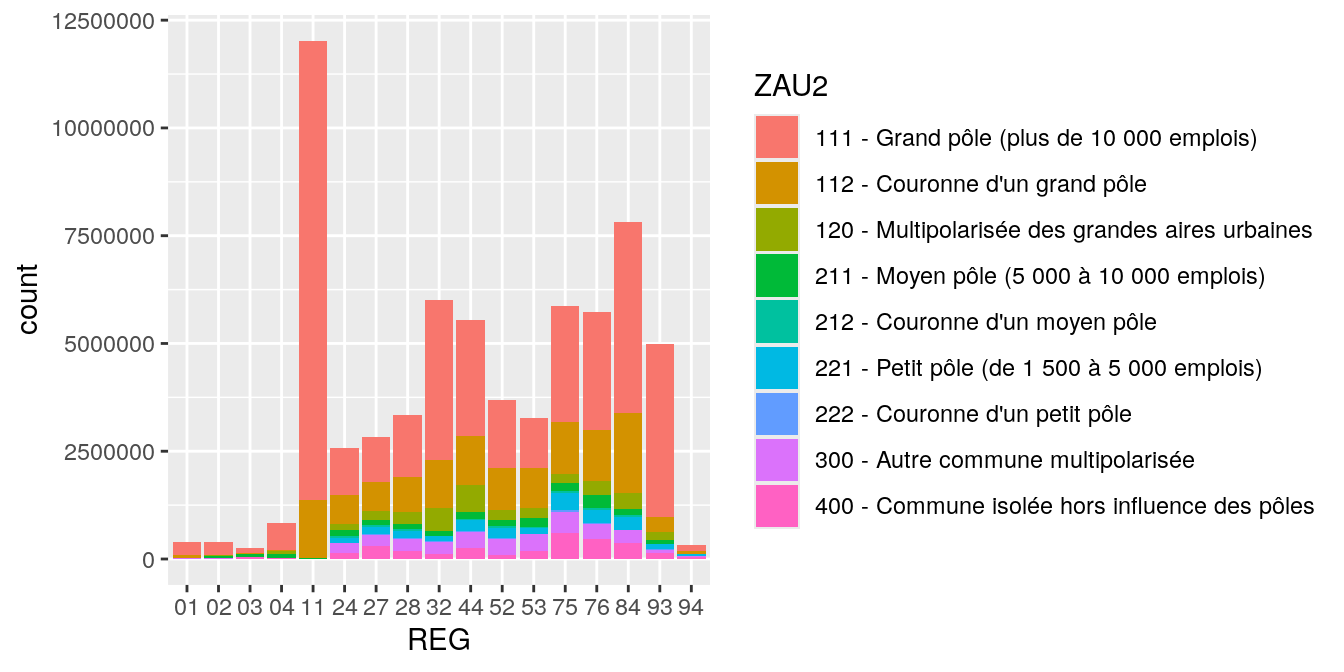 Pour visualiser un croisement de deux variables qualitatives, il est possible de faire un diagramme superposé. La fonction est similaire aux diagrammes en bâtons déjà tracés. Cette fois, on précise dans aes que les régions sont sur l’axe, et que les différents ZAU sont colorés (argument fill